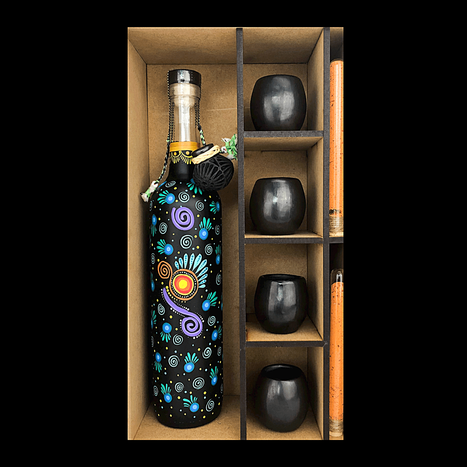 Contiene 750 ml de Mezcal Artesanal Espadín Joven. Ahumado sutil, con notas marcadas de cítricos, azahar y hierba fresca, que dan paso a notas más frutales y de mezquite y tierra mojada.